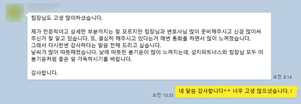 팀장님도 고생 많이하셨습니다. 제가 전문적이고 상세한 부분까지는 잘 모르지만 팀장님과 변호사님 많이 준비해주시고 신경 많이써주신거 잘 알고 있습니다. 또, 열심히 해주시고 있다는거 매번 통화를 하면서 많이 느껴졌습니다. 그래서 다시 한 번 감사하다는 말씀 전해 드리고 싶습니다. 날씨가 많이 따뜻해졌습니다. 낮에 따뜻한 봄기운이 많이 느껴지는데, 성지파트너스와 팀장님 모두 이 봄기운처럼 좋은 일 가득하시기를 바랍니다. 감사합니다.